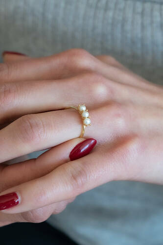 Üç zarif inciyle tamamlanan bu ince formlu yüzük, el işçiliğiyle pirinç üzerine altın kaplama olarak üretilmiştir.