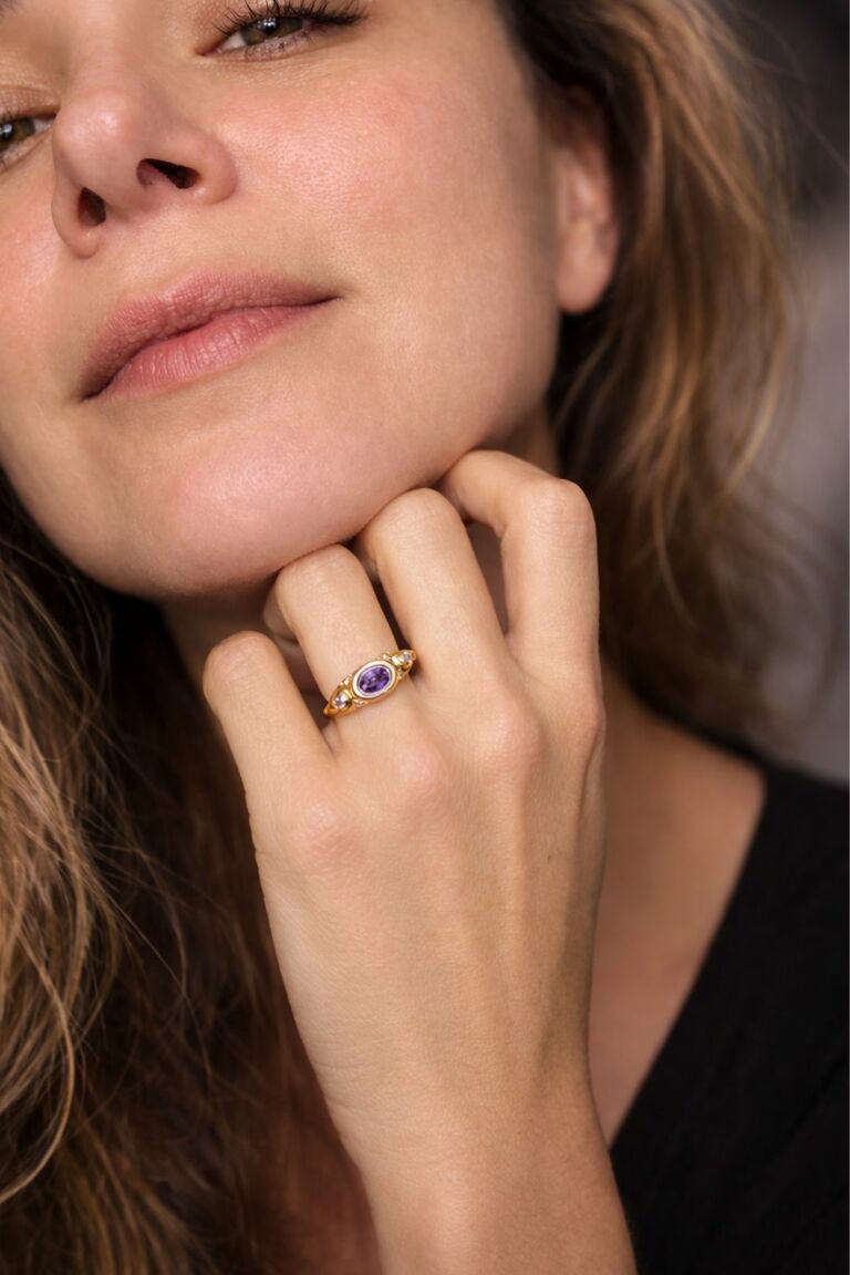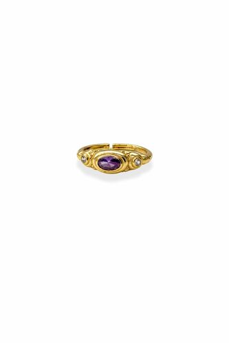Lune Yüzük, merkezde yer alan mor taş detayı ve zarif altın formuyla sofistike ve romantik bir duruş sunar. Oval kesim taşın ışıltısı, yanlardaki küçük taş detaylarıyla dengelenerek tasarıma zarif bir parıltı kazandırır. İnce yapısı sayesinde günlük kullanım için ideal olduğu kadar, özel kombinlerde de şık bir tamamlayıcıdır.