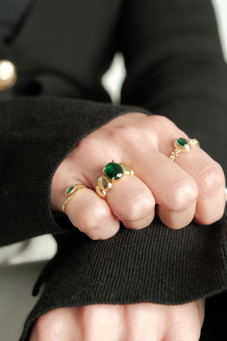 Pirinç üzeri altın kaplama, yeşil taş detaylı.