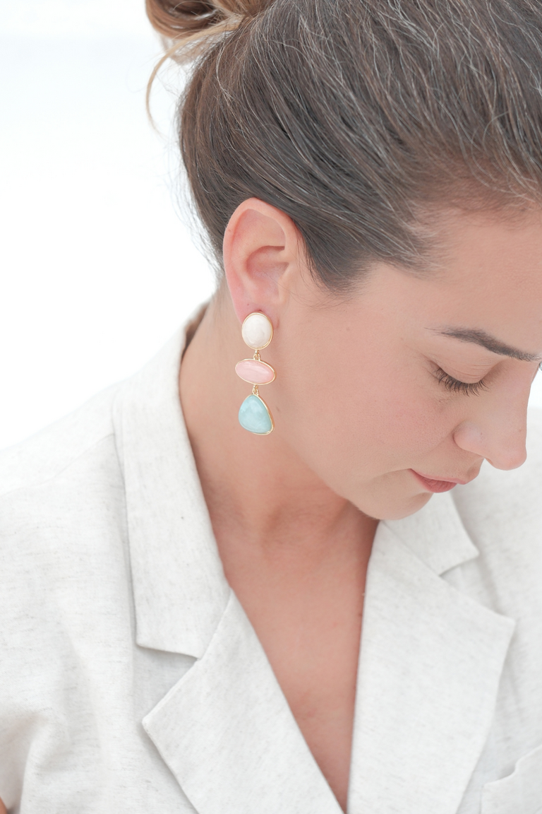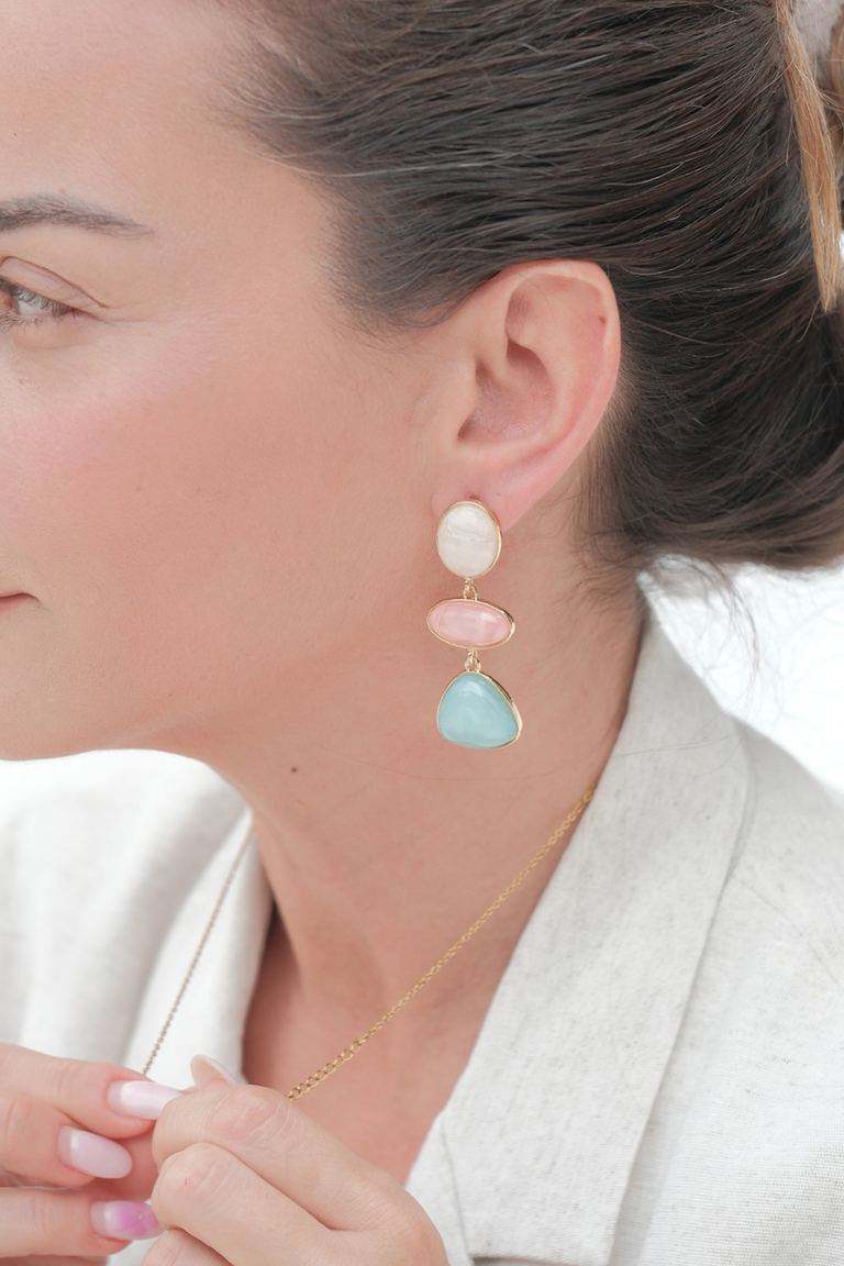 Mixed Bonbon Küpe, üç farklı taşın uyumlu birlikteliğiyle modern ve enerjik bir stil sunar. Beyaz, pembe ve mavi tonlardaki taşları altın kaplama çerçeve ile buluşarak hem gündüz hem gece kombinlerinize canlılık katar. El yapımı tasarımı sayesinde her parça eşsizdir. Hem günlük kullanım hem de özel davetler için ideal bir seçimdir.