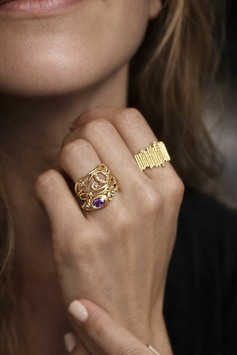 Sadie Yüzük, akışkan altın formu ve çoklu taş detaylarıyla zarif ama dikkat çekici bir tasarım sunar. Ortadaki oval taş ve etrafına yerleşen küçük ışıltılar, yüzüğe dengeli ve sofistike bir görünüm kazandırır. Katmanlı yapısı sayesinde tek başına güçlü bir etki yaratır; özel anlar için ışıltılı, günlük kullanım için ise zarif bir tamamlayıcıdır.