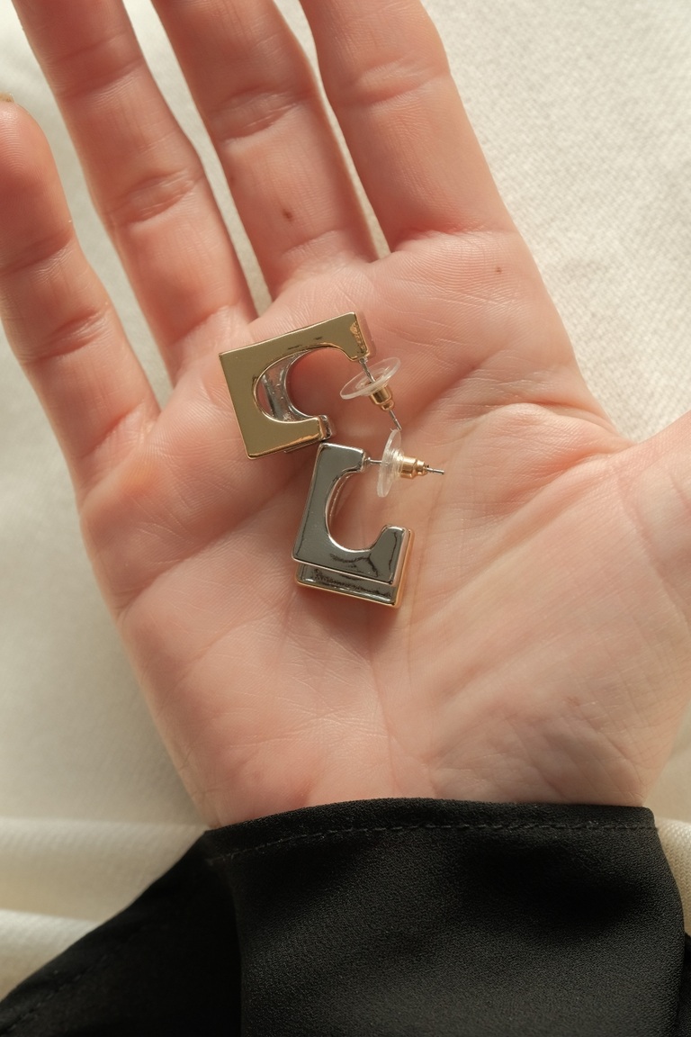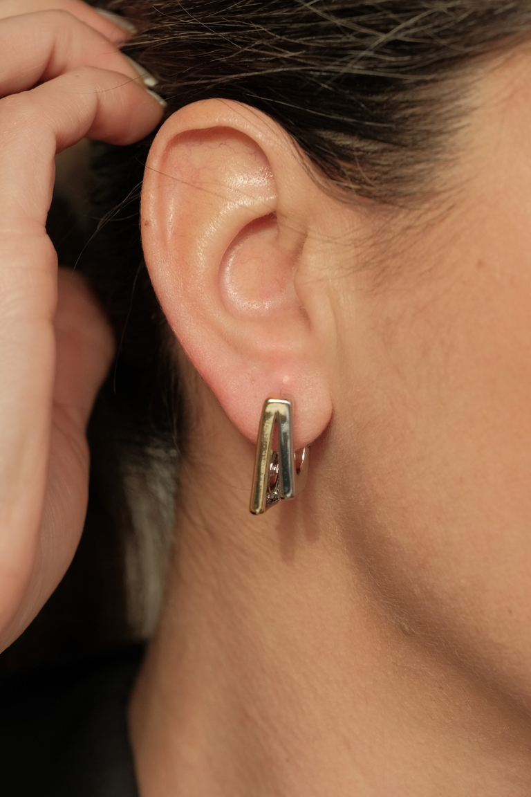 Sage Two Tone Küpe, altın ve gümüş tonlarının geometrik bir formda bir araya geldiği modern ve güçlü bir tasarımdır. Keskin hatları ve dengeli hacmiyle kulakta net bir duruş yaratır; minimal stilini biraz daha cesur bir dokunuşla tamamlamak isteyenler için ideal bir parçadır. İki tonlu yapısı sayesinde farklı takılarla kolayca kombinlenebilir.