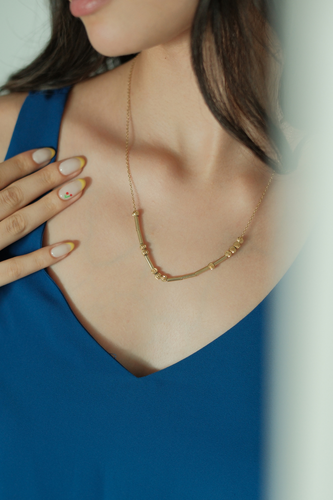 Farklı boyutlardaki silindirik ve yuvarlak formların birleşimiyle dikkat çeken bu kolye, pirinç üzerine altın kaplama olarak el işçiliğiyle hazırlanmıştır.
