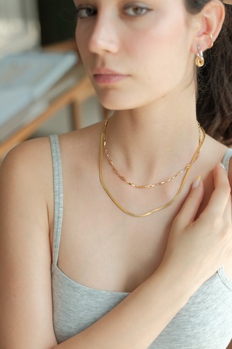 Twinline Set kolye, iki farklı zincir formundan oluşur. Şekilli zincir 40 cm, yılan zincir ise 45 cm uzunluğundadır. 5 cm uzatma zinciri ile boyu ayarlanabilir. Pirinç üzeri altın kaplama yapısı sayesinde günlük kullanım için uygundur.