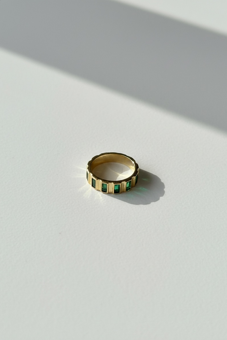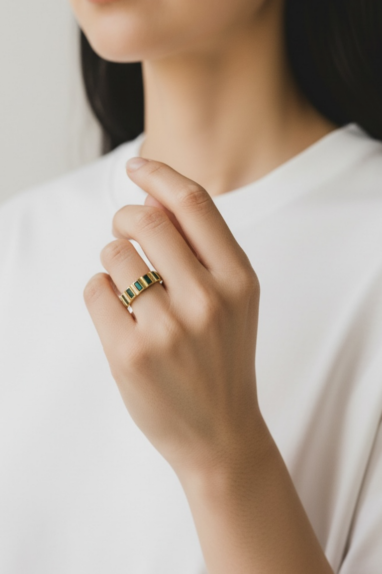 Verona Yüzük, dikdörtgen yeşil taş detaylarıyla modern ve zarif bir görünüm sunar. Ayarlanabilir yapısıyla her stile ve parmağa rahatça uyum sağlar.